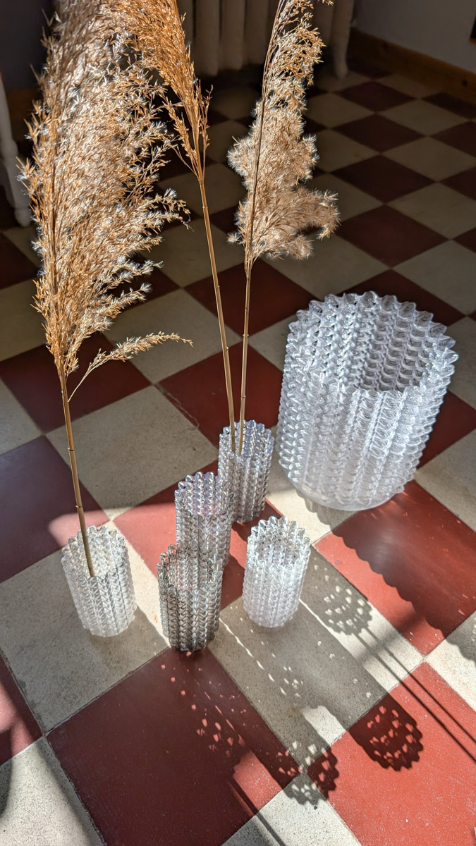 Imprimé en 3D à partir de PETg recyclé, l’objet utilise la technique du dépôt de fil pour capturer la fluidité de l’eau. La texture de sa surface, résultat du dialogue entre le rythme mécanique de l’impression et le flow organique de la matière, évoque les reflets vibrants d’un courant, les ondulations d’une berge ou les lignes changeantes d’une lumière traversant la surface.