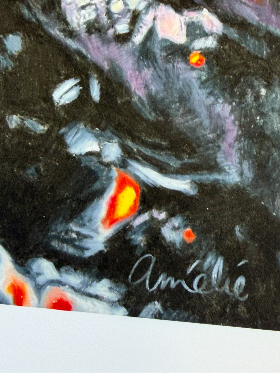 Amélie utilise des crayons de couleurs et des pastels gras dans ses créations artistiques.