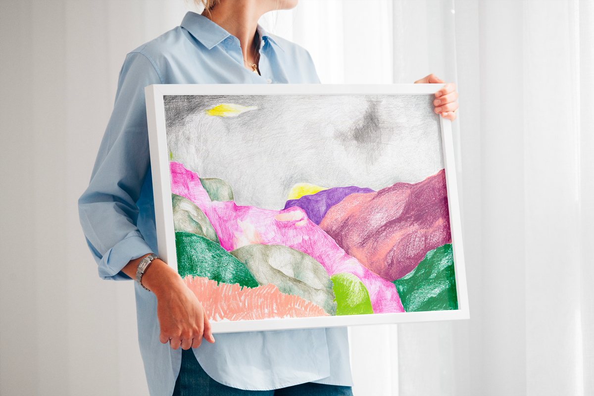 Inspirée par le paysage et ses lignes — crêtes, horizons, reliefs — Léa Czermak De Alencar les transpose en formes abstraites et colorées pour proposer un paysage imaginaire et immersif.