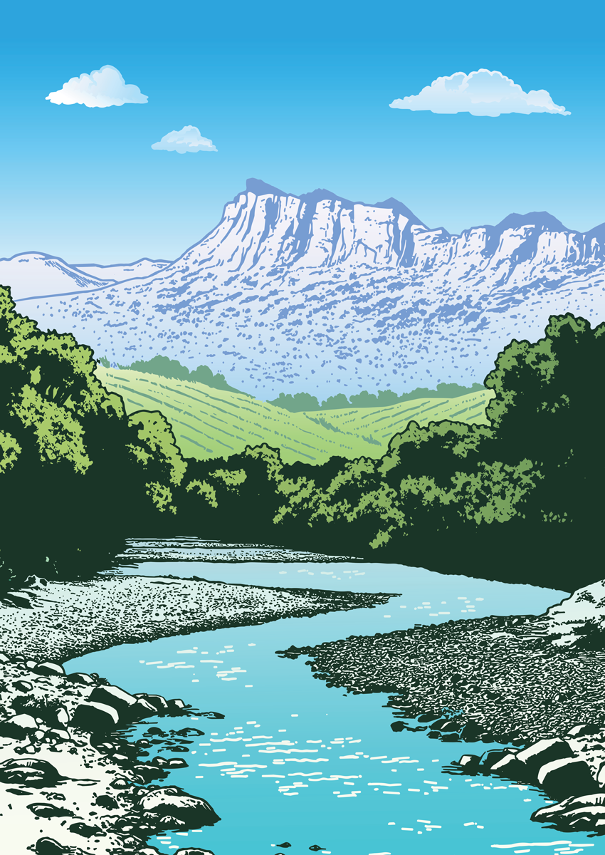 Pour la saison 01 Rivière. Reflets, Timothy a créé une illustration qui représente le paysage "image d'épinal" de la Drôme, à la fois sauvage et imaginaire, comparable aux grands parcs nationaux.