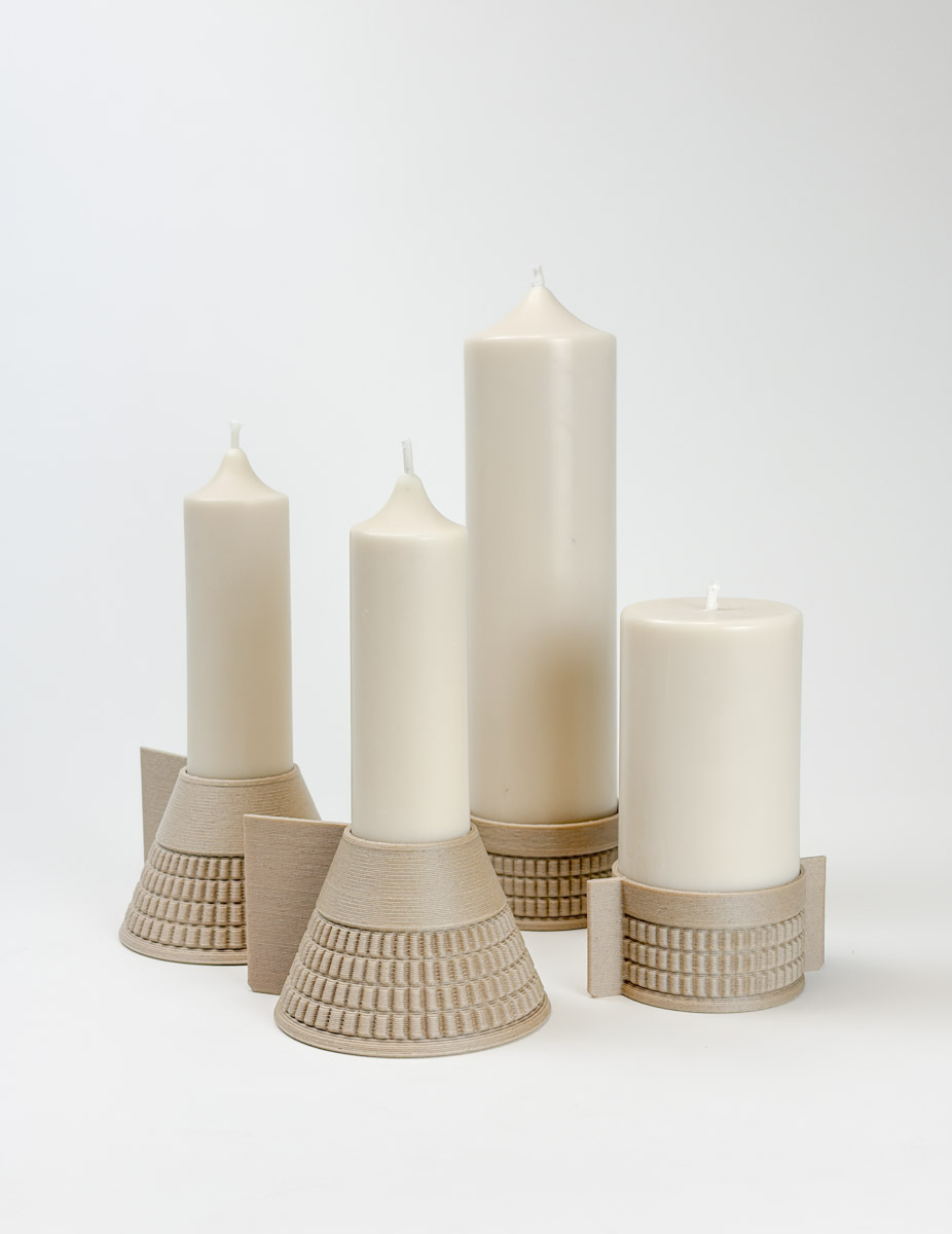 Pensés pour accueillir trois bougies artisanales de formats différents, ils mêlent géométrie élémentaire et geste symbolique. Cylindre et cône tronqué deviennent socles stables pour la flamme, tandis que les poignées latérales — clin d’œil aux bougies à main d’autrefois — facilitent la transmission ou le déplacement de la lumière. Imprimés en 3D en PLA chargé en fibres de bois, ces objets mono-matière affichent une texture gaufrée évoquant autant le biscuit que l’architecture. Le relief, obtenu par dépôt de fil, souligne leur fabrication couche par couche et invite au toucher